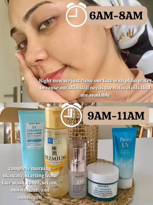 At this early hour, it's enough to rinse your face with plain water. Why? Because your skin still holds onto natural oils that protect and hydrate—no need to remove them away just yet.