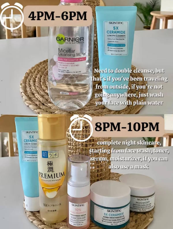 This is prime time for your full night routine. Cleanser, toner, serum, and moisturizer should all be in play here. Want extra glow? Add a face mask to your routine and give your skin that extra love before bedtime.