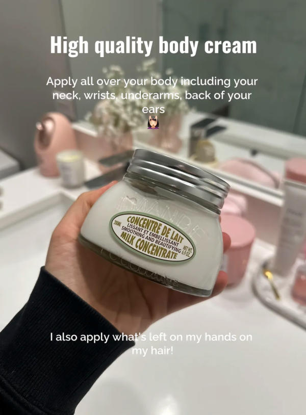 Layering is key! A high-quality body cream will seal in moisture and keep your skin soft and hydrated. Choose one with a natural, light fragrance, like vanilla, shea, or almond. Apply it everywhere for a smooth and soft feel.