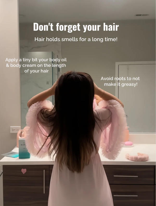 Your hair can hold scent just as strongly as your skin. Lightly apply body oil or cream to the ends of your hair for a soft, lingering aroma that follows you all day.