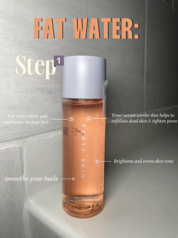 After giving your feet a good cleanse, apply a toner-serum like Fenty Skin Fat Water to a cotton pad and sweep it across your feet. Though made for the face, this product works beautifully on feet too. It helps remove dead skin buildup while refining texture.