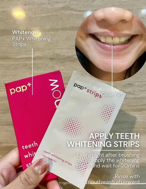Next, apply white strips and leave them on for about 20 minutes. After removing them, rinse with mouthwash to freshen up.