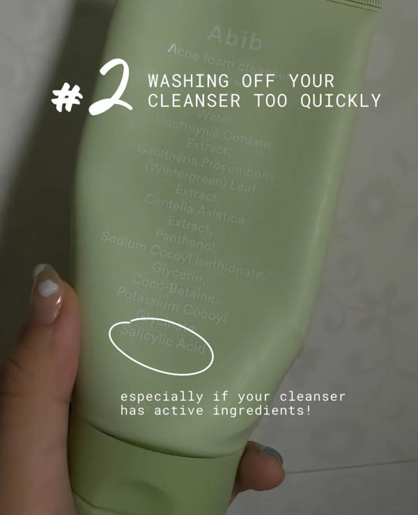 Washing your face in a hurry? Some cleansers, especially those with active ingredients like BHAs, need a little more time to do their job. Letting it sit for about two minutes allows those actives to work properly before rinsing off — it's a small habit that can bring better results over time.