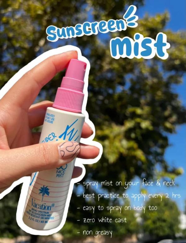 For those who love quick fixes, an SPF mist like Vacation’s sunscreen spray is a must-have. It smells amazing and offers an invisible finish—just be sure to apply enough for proper coverage. Another option is the refreshing mist from Love from Yours, which also feels weightless and leaves no white residue.