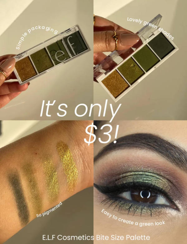 Next is the E.L.F. Bite-Size Eyeshadow Palette in Jalapeño—a dream come true for fans of green eyeshadow. The pigments are incredibly rich, especially for such an affordable product. The shimmer shades in this $3 palette perform like high-end options, and there are multiple color themes to choose from.