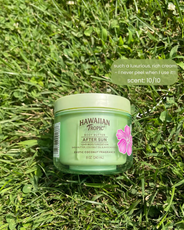 This body butter is surprisingly affordable but feels incredibly luxurious. It carries that classic Hawaiian Tropic scent, ideal for summertime or after a day at the beach. The rich blend of coconut oil, avocado oil, and shea butter keeps skin hydrated and smooth, preventing peeling from sun exposure. It's my secret for soft, nourished skin even after long sun-filled days.