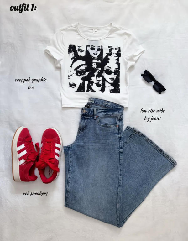 Keep it fun and laid-back with a cropped graphic tee paired with low-rise, wide-leg jeans. This combo gives off a cool streetwear aesthetic that’s easy to pull off. Finish the look with chunky sneakers — opt for a classic 00s silhouette or any style with a retro vibe — and top it off with your favorite accessories. Simple, confident, and perfectly casual.