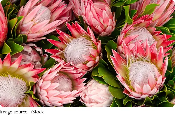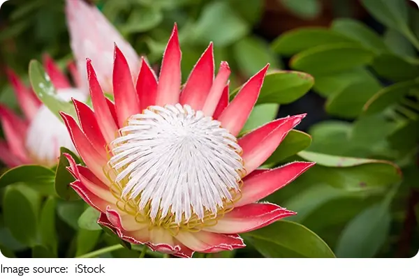 The King Protea (Protea cynaroides) is native to South Africa and is famous for its large bloom and striking shape. Its unique structure is a cluster of many small florets surrounded by broad, colorful bracts, giving it a distinct, almost architectural appearance. One fascinating feature is that King Proteas have male and female forms, which we can identify just by observing their structure.