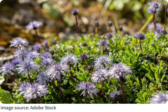 When blooming season arrives, small rounded blue blossoms appear just above the leaves. They are not loud or oversized, yet they feel special precisely because of their restraint. You might find yourself leaning closer to appreciate them. These blooms often attract gentle pollinators, adding quiet movement to rocky spaces. The plant seems to offer its flowers as a thank-you rather than a demand for attention.